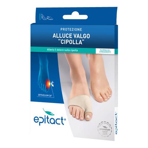 ALLUCE VALGO (DURONE) PROTEZIONE ALLUCE VALGO epitact Dispositivo Medico CE. Protezione utile in caso di dolore all'alluce valgo generato da sfregamento. Si tratta di un sottile inserto di Epithelium 26 da 1 mm, che indossato sulla "cipolla", riduce gli sfregamenti senza aggiungere ulteriore pressione. La protezione può essere indossata su entrambi i piedi rivoltandola. Il prodotto è ideato per proteggere e non per correggere la malformazione. La protezione è lavabile, riutilizzabile e disponibile in tre taglie (Small, Medium, Large). Componenti Gel in silicone brevettato (Epithelium 26).